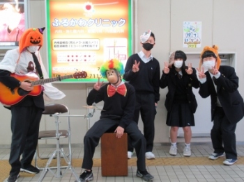 また、併せて附属高校の軽音楽部によるギターの弾き語りや、吹奏楽部のミニコンサートも募金活動場所で行い、和やかな雰囲気を作り上げ、駅を利用される方々が興味を示してくれる様子が見受けられました。