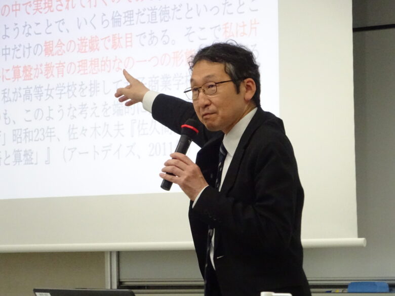 後半は、創立者佐久間惣治郎の教育理念を、渋沢との関係性や対比の中から解説し、建学の精神の奥深き背景の世界に学生をいざないました。また、渋沢は多くの大学の創立に関わりましたが、建学の精神に「論語と算盤」を掲げるのは本学園のみであるということにも触れています。