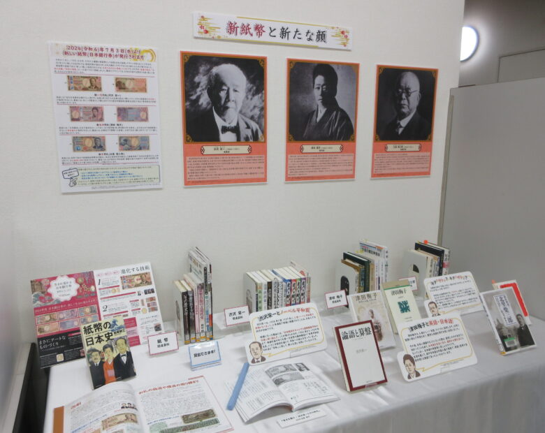 千葉経済大学総合図書館では、新紙幣発行にちなんで「新紙幣と新たな顔」という展示を行っています。新紙幣に描かれている、一万円札:渋沢栄一、五千円札:津田梅子、千円札:北里柴三郎の業績や、紙幣そのものについて、関連図書やパネルにて展示しています。ぜひご覧ください!
