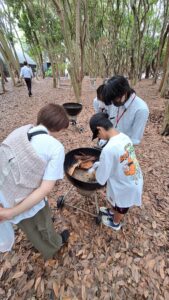 10月4日(土)稲毛海岸にある「Small Planet Grill&Cafe」の敷地をお借りして、小学校低学年を対象に「サバイバル体験」イベントを実施しました。普段から家族とキャンプを経験している生徒や、趣味で工芸が好きな生徒を中心に「火起こし」や「ロープワーク」、稲毛海岸で拾った「貝」を工作した「シーキャンドル」を作りました。