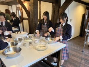 翌日は、スコーン作りをしました。スコーンの材料を入れ、ボウルや小さじ・大さじの呼び方、作るときの注意点を英語で学ぶことができました。また、お土産の会計を英語ですることによって、英語での物の買い方を学ぶことができました。