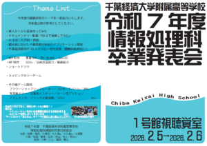 2月5日(木)・6日(金)に、情報処理科3年生が「課題研究卒業発表会」を行いました。3年間の学びの集大成とした研究テーマは、「オンラインゲーム制作」、「千葉経済高校3Dモデリング化」など、さまざまな分野で11グループが発表し、成果や考察、活動の中で苦労したことや得られたこと、そして後輩へのアドバイスなども発表しました。