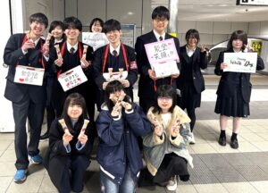 3月13日(金)千葉市都市モノレール千葉駅で、生徒会が地域貢献活動の一環としてプロデュースした「銚子電鉄のまずい棒(第20弾新フレーバーショートケーキ風味)」を千葉駅利用者の方々にプレゼントしました。生徒会発案で企画(2月13日のバレンタイン企画に続き)、『はっぴー!ホワイトデー』のかけ声と共に、地域の方々に笑顔を届けました。