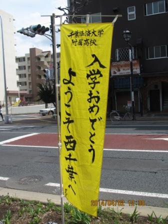 新入生のみなさん、ご入学おめでとうございます。 「ようこそ西千葉プロジェクト」の立案により、西千葉駅より本校に向かう通学路に 新入生歓迎の黄色いのぼり旗が設置されました。 のぼり旗は、本校書道部生徒の執筆によるものです。 満開の桜と共に、みなさんのご入学を心よりお待ちしています。