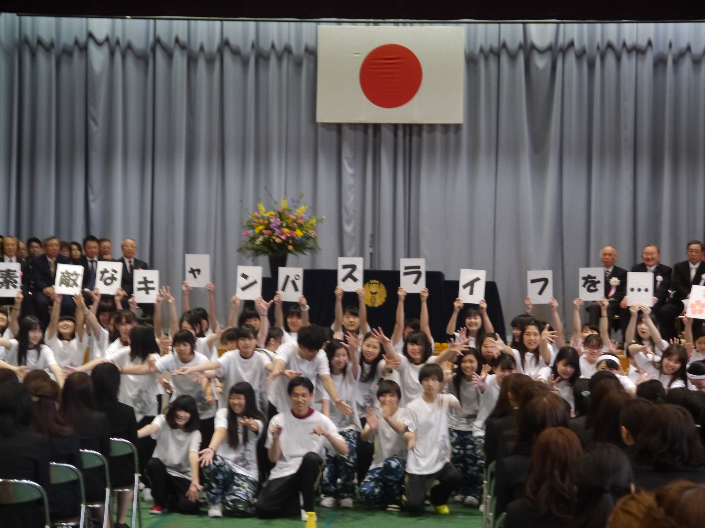 大学・短大の入学式において、ストリートダンス部の生徒が力強いダンスパフォーマンスを披露し、新入生を熱く歓迎しました。式場は力強い熱気で大変盛り上がりました。 本校は、大学・短大・高校での連携活動を通して学園全体の絆を深めています。