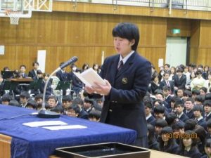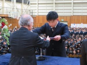3月3日(土)、卒業証書授与式が晴れやかに、そして厳かに挙行されました。卒業生は637名です。 校長先生は式辞で、日野原重明さんの言葉を紹介して、自分のおよそ20歳くらい年上と思われる年齢の人を探して、20年後にはそういう人になりたい、その人に近づこうと心して生きていってくださいと、前途洋々たる門出を祝福しました。