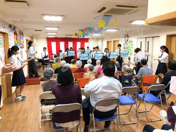 9月22日(土)、吹奏楽部が「グループホーム白雲館」の敬老の日イベントで演奏会をさせて頂きました。 利用者の方々の長寿を祝福しつつ、これからもお元気でお過ごし頂きたいという思いを込めて参加しました。部員ひとりひとりが演奏を楽しみ、利用者の方々と目と目を合わせてコミュニケーションをとることで、心あたたまるとても素敵な時間を過ごすことが出来ました。利用者の方々にも大変お喜び頂き、やりがいを感じた価値ある体験となりました。