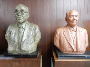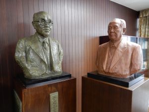 ところで、佐久間惣治郎は一昨年、渋沢栄一と“顔”を合わせることになりました。胸像製作会社が、貴重な渋沢の胸像を学園理事長室の惣治郎の胸像のもとにお持ちくださったのです。そのときの画像をご覧ください。「論語と算盤」の精神で結ばれた2人の、年月を経ての対面でした。