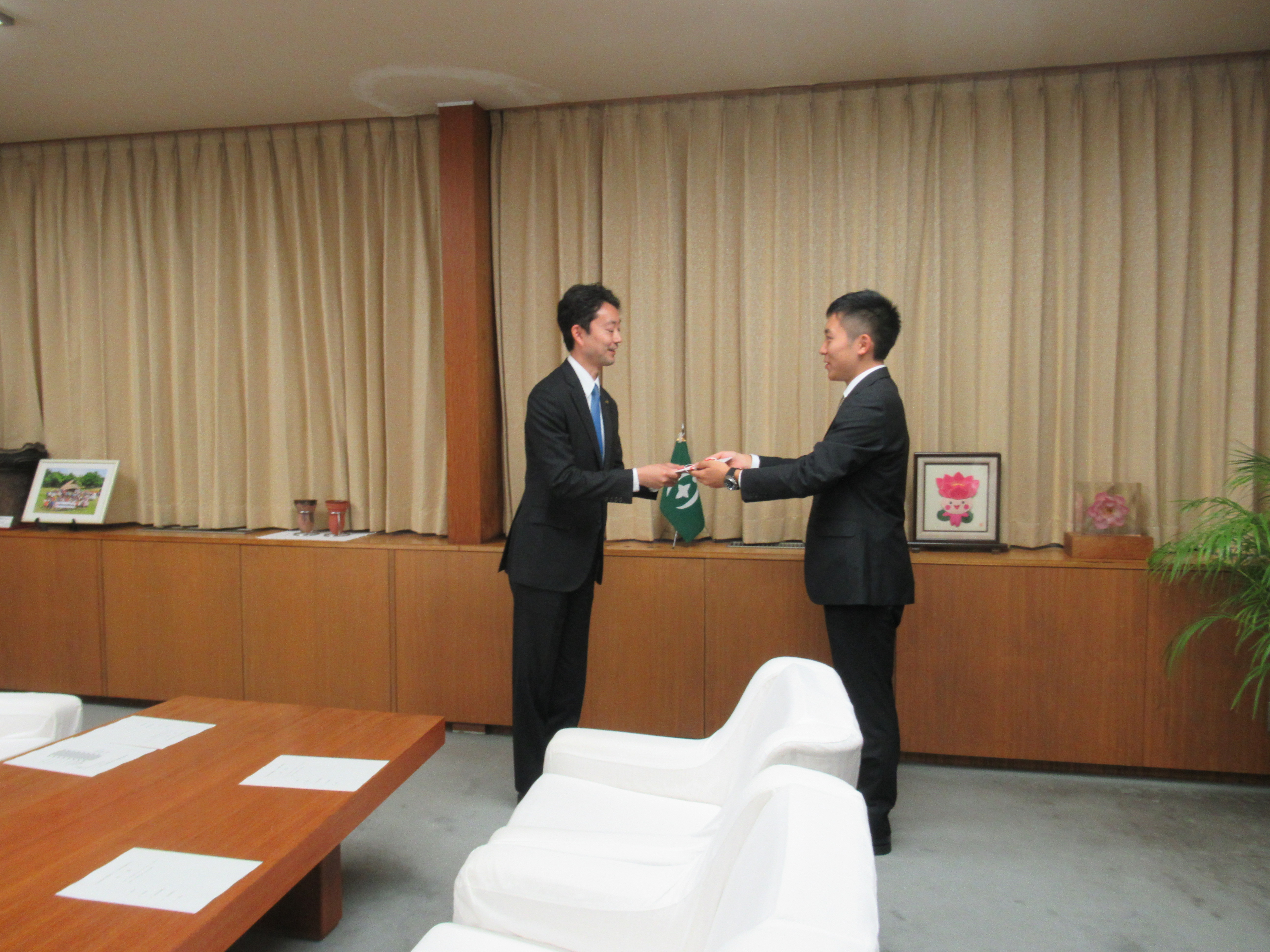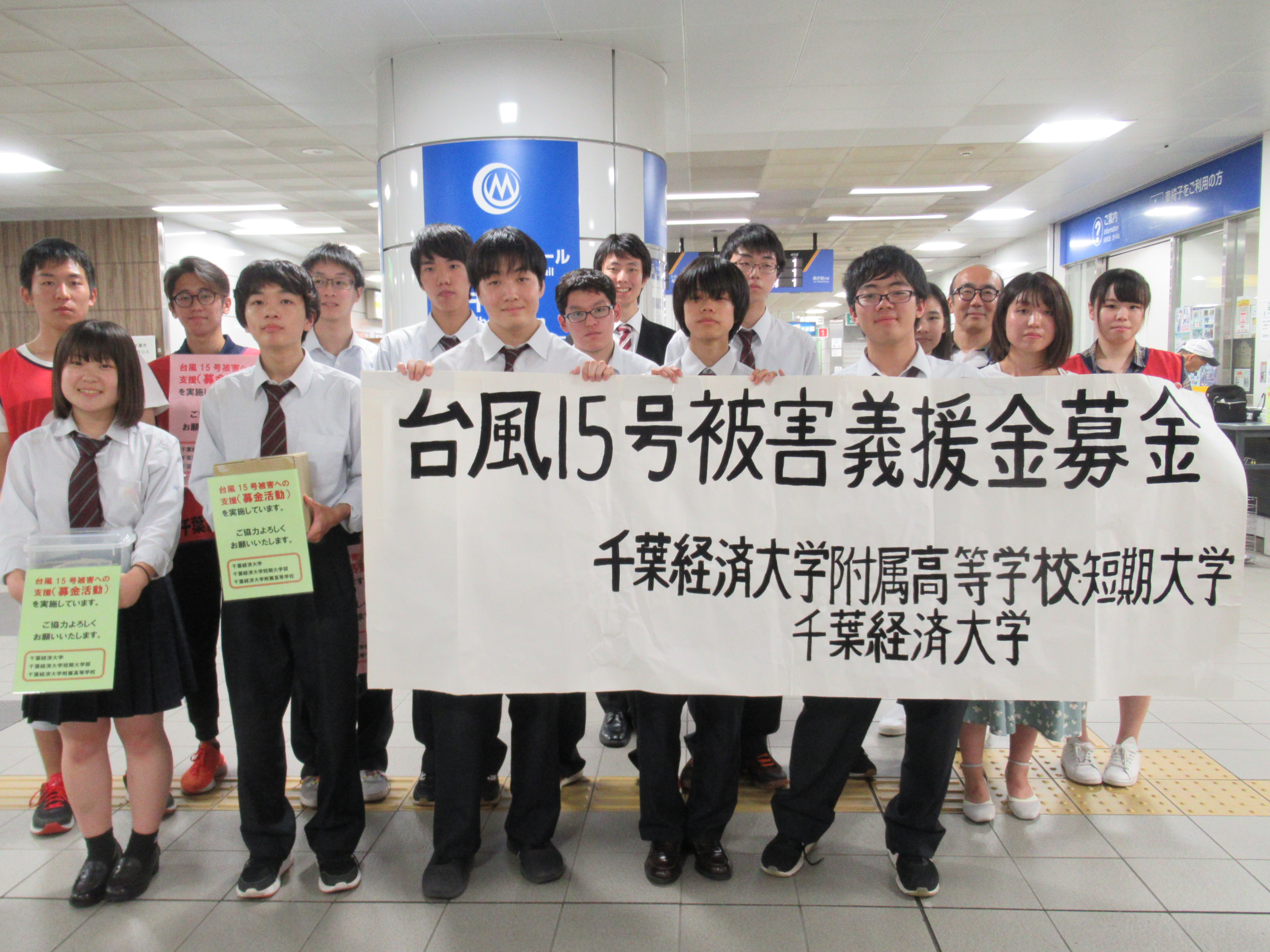 千葉経済学園ボランティアセンターでは、9月17日から20日まで附属高校の新館1階で、9月25日には千葉都市モノレールの千葉駅改札口前のスペースで、台風15号によって被害を受けられた方々のお役に立てるよう募金活動を行いました。 それに参加した本学学生2人と附属高校の生徒3人、佐久間学長をはじめとする教職員4名が、10月31日に、千葉市役所にて熊谷俊人市長へ募金の全額を千葉市への寄付として贈呈しました。 市長からは、「非常に心強く嬉しく思います。復旧、被災者支援に活用させて頂きます」との温かい言葉をいただきました。 被害に遭われた方々へ心よりお見舞い申し上げ、一日も早い復旧をお祈りいたします。